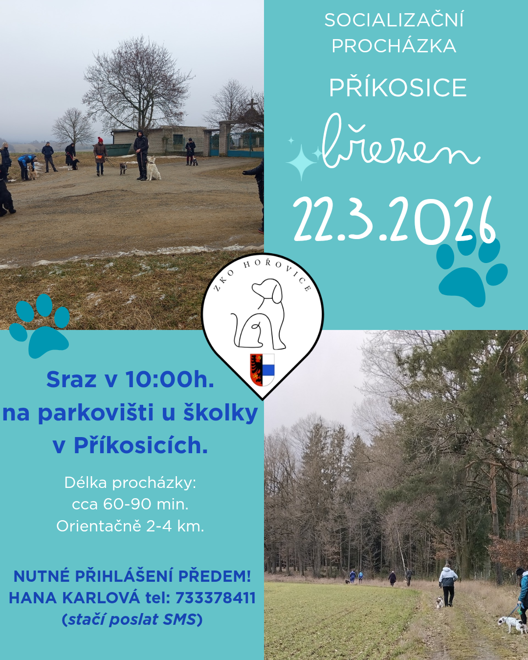 Srdečně vás zveme na březnovou socializační vycházku, která se uskuteční v neděli 22. 3. 2026. Sejdeme se v 10:00 hodin tradičně na parkovišti u mateřské školy v Příkosicích.